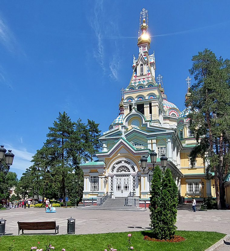 В парке есть Вознесенский кафедральный собор, который возвели в 1904-1906 годах. Я не один раз слышала историю о том, что этот собор построен из бруса, без единого гвоздя. Он устоял при сильнейшем землетрясении. Собор считается одним из самых высоких в мире, его высота составляет 54 метра. Интересный факт, это то, что церковь выдержала сильнейшее землетрясение, которое было в 1910 году в городе Верном (так на тот момент назывался город Алматы). Сейчас в соборе проходят службы, венчания, крещение.