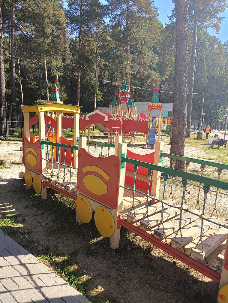 Территория огромная и очень ухоженная. Так как это детская денежная дорога, то рядом со станцией, откуда отправляются поезда, есть небольшой детский городок, в стилистике вокзала и поездов.