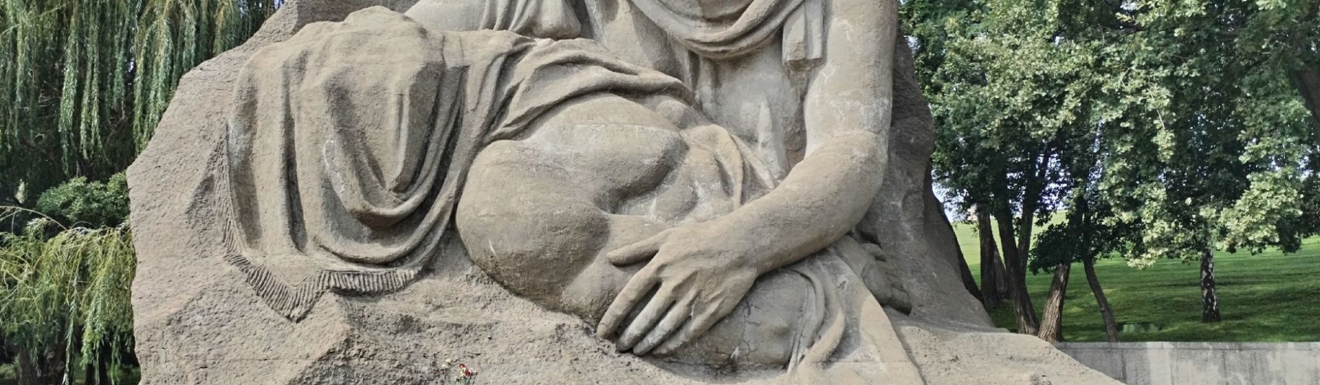 Мемориальный комплекс начинается с аллеи и водной композиции, на которой изображено 11 скульптур, изображающих людей, пребывающих в скорби и унынии.