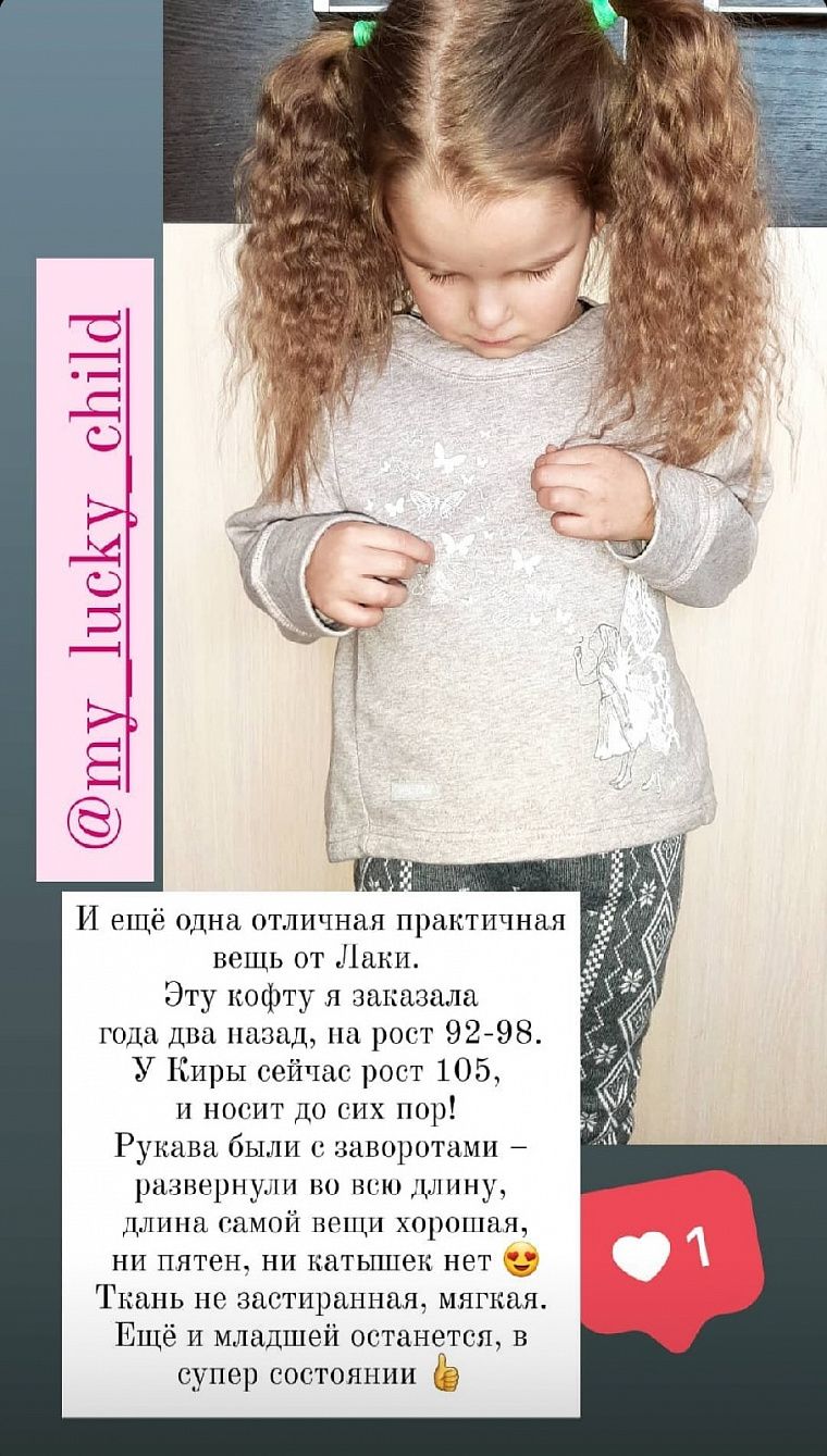 «Первые вещи от Lucky Child мы получили 11 июля 2019 года. Тогда я заказала этот комплект из коллекции «Улицы» и ещё несколько вещей из коллекции «Интернет». Впервые одели комплект в августе, когда на утренних прогулках стало уже прохладно, сыну тогда было пять месяцев. Одевали его часто и стирали тоже часто. Но качество не менялось, и я всё больше удивлялась этому. Постоянно думала: сейчас похолодает, и мы эти вещи уже не оденем. Но в мае 2020 года я удивилась, что сыну кофточки всё ещё подходят, и была рада, что их ещё можно одевать. Ползунки, конечно, уже не подошли по размеру, но и они не остались без дела: мы сделали из них домашние шорты. А кофточки одевали вечерами, когда на улице было прохладно. Сейчас эту кофточку носит маленькая девочка. Её мама купила платье из той же коллекции, а мы подарили кофточку».