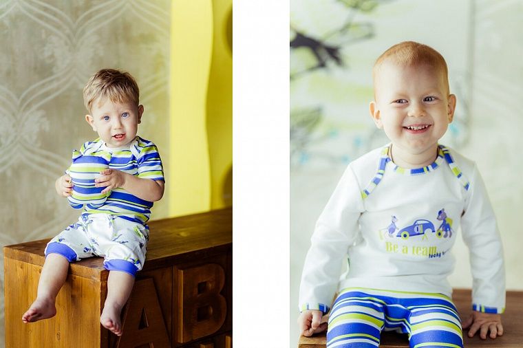В русском народном календаре май называют травником, потому что земля покрывается свежей сочной зеленью. Дизайнеры так воодушевились картиной молодых лугов и чистым голубым небом, что создали целую коллекцию в такой цветовой гамме. А для кого ещё, кроме как для маленьких мальчиков, должна быть пошита эта забавная серия одежды. Яркий салатовый, неоновый синий, белый интерлок украсили принтом из машинок и назвали коллекцию «Маленький гонщик».
