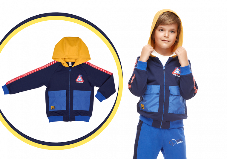 Эта модная толстовка сочетает в себе все характеристики идеальной одежды для мальчика: комфортный хлопковый футер, большой капюшон на широких завязках, мягкие манжеты, накладной карман-кенгуру. В модели использован немаркий синий базовый цвет и полосатое трикотажное полотно для контраста. Купить эту удобную толстовку для мальчика – лучшее решение для любого родителя.Нет удобнее одежды для мальчика, чем простая мягкая толстовка. Эта модель из комфортного хлопкового футера с широкими манжетами и горловиной, которые не растянутся со временем. Мальчикам особенно понравится дизайн: стильная полоска из базовых цветов и модный принт делают толстовку яркой и эффектной.Демисезонная куртка для мальчика – очень важный элемент гардероба. Эта куртка из синего хлопкового футера и с массой интересных деталей: большой капюшон на широких завязках, большие накладные карманы из прочной курточной ткани, жаккардовая лента на рукавах, яркий принт на водной основе. Родители особенно оценят мягкие манжеты, которые не растянутся со временем, и молнию с ограничителем, чтобы не зацепить шею ребёнка.Удобные брюки – основа гардероба для мальчика. Эти брюки из мягкого голубого футера скроены так, что будут максимально комфортны для любого ребёнка. У них широкая резинка на талии и манжеты на штанинах, контрастные тёмно-синие лампасы, для маленьких размеров предусмотрено дополнительное пространство для подгузника. Подойдут для мальчиков от полугода до 7 лет.