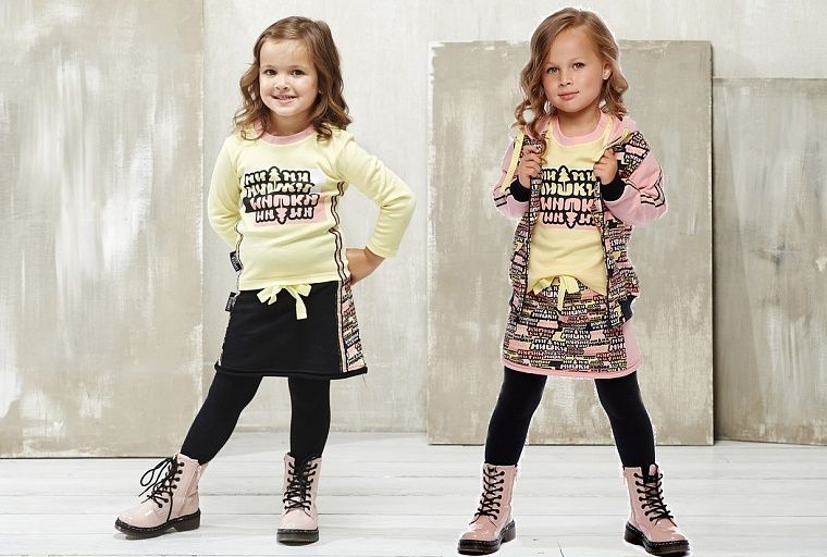 Коллекция для девочек выполнена в сложных оттенках розового, светло-розового, пастельного жёлтого и чёрного. Коллекция несёт нежный, женственный характер, но при этом довольно активный и позитивный. Цвета коллекции: молочный, светло-розовый, розовый, пастельный жёлтый, чёрный.