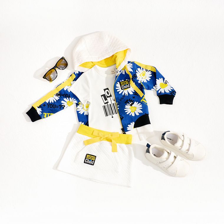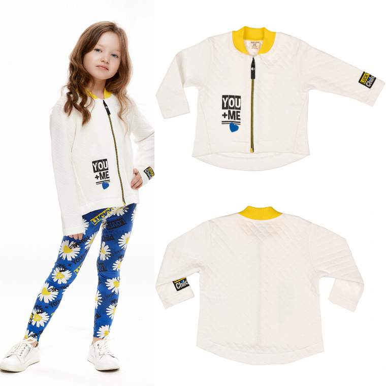 Лёгкая куртка для девочки – важный элемент гардероба. Эта куртка из синего хлопкового футера и с массой интересных деталей: большой капюшон на широких завязках, жаккардовая лента на рукавах, яркий принт на водной основе.Эта куртка из молочного стёганого полотна «капитоний». Этот материал дышит, но при этом согреет прохладным вечером. Родители особенно оценят мягкий трикотажный ворот, который не растянется со временем, молнию с ограничителем, чтобы не зацепить шею ребёнка, и удлинённую спинку.Нет удобнее одежды для ребёнка, чем простая мягкая толстовка. Эта модель из комфортного хлопкового футера с широкими манжетами и горловиной, которые не растянутся со временем. Любой девочке понравится дизайн: молочный цвет и модный принт с ромашкой делают толстовку яркой и эффектной. Рукава украшены контрастной жаккардовой лентой.Эти брюки из мягкого голубого футера скроены так, что будут максимально комфортны для любого ребёнка. Для маленьких размеров предусмотрено дополнительное пространство для подгузника. На талии широкая резинка с декоративным бантиком, внизу штанины обработаны так, что они не растянутся и не потеряют форму.