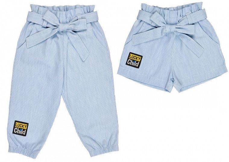 Брюки и шорты с высокой талией сегодня должны быть в гардеробе не только у мамы, но и у каждой модной девочки. Такие брюки из поплина создали дизайнеры Lucky Child. У них высокая талия с хлопковым поясом-завязкой, у брюк – актуальные зауженные штанины. Материал поплин с мелкую бело-голубую полоску – идеальный выбор для таких моделей: он не склонен к сминанию, прочный, а полосатый узор освежает и напоминает о море. Карманы в брюках – удобный элемент, который оценит каждая девочка.