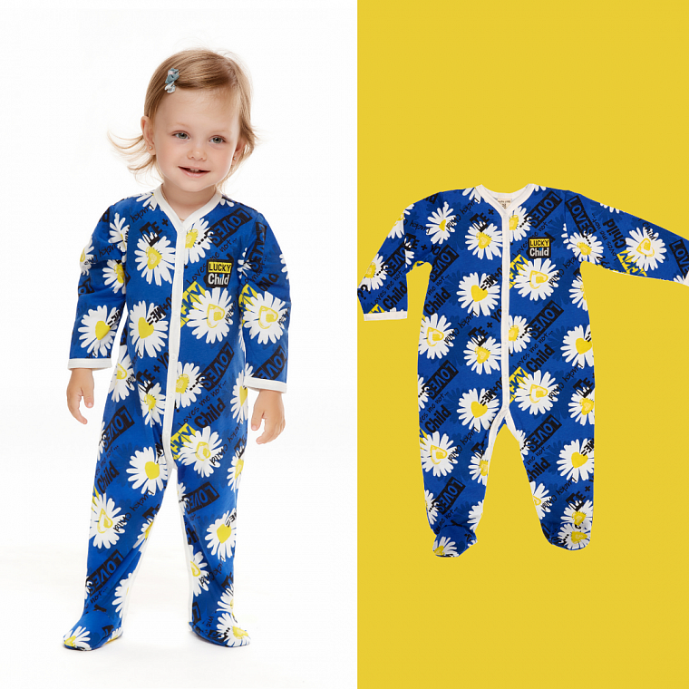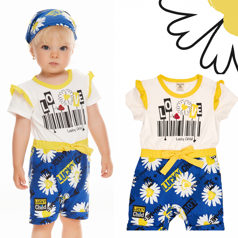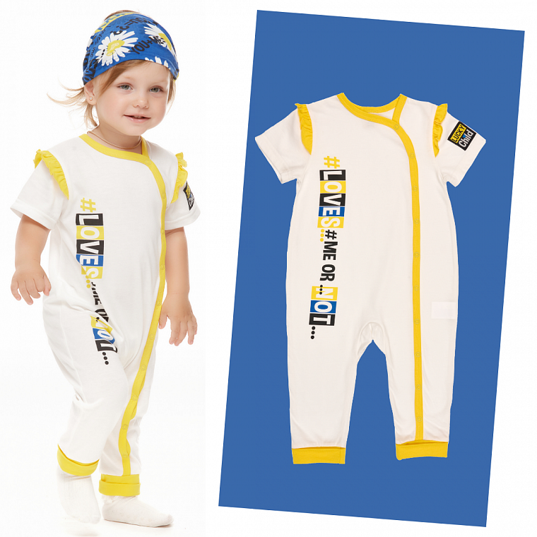 Любите необычные вещи? Значит, вас уже покорил этот полукомбинезон для девочек от рождения до 1 года. В этой модели сочетается нежный молочный цвет верха и синий с принтом низ – как будто девочка в костюмчике! В нём всё продумано: контрастная обработка срезов, милые жёлтые рюши на плечах, удобная застёжка на кнопках на плече и внизу для смены подгузника. Яркие принты на водной основе «дышат», не выгорают, не тускнеют и не боятся утюга.