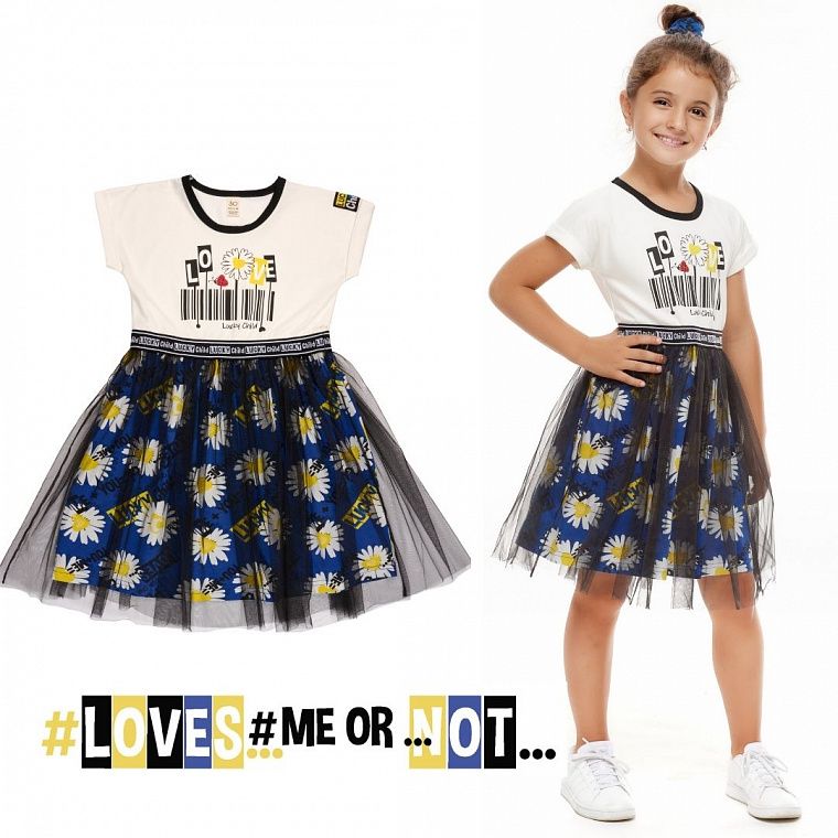 Платья из коллекции «Любит – не любит» – это воплощение творческой дизайнерской мысли. Это платье подойдёт таким же творческим и ярким девочкам от 1 года до 7 лет. Необычный вариант рукавов сразу привлекает внимание: один рукав втачной, вместо второго – бретелька из жаккардовой ленты с фирменным принтом. Такая же лента отделяет верх платья от пышной юбочки по низу, которая украшена вторым ярусом из фатина. На груди – большой яркий принт на водной основе, который не боится утюга. Удобная, необычная и незабываемая вещь!