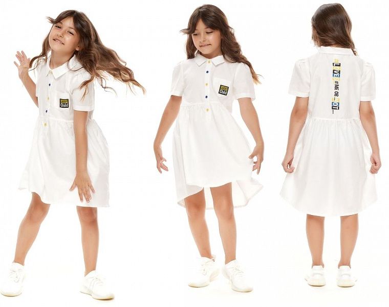 Это платье на фото ниже может стать идеальной покупкой, благодаря хлопковому поплину, который не склонен к сминанию, нарядному молочному цвету, пышной удлинённой сзади юбке и ярким деталям. Разноцветные пуговицы на классической планке, отложной воротник в тон, рукава-фонарики, кармашек с фирменной нашивкой Lucky Child – и это ещё не все детали. Стоит девочек повернуться, как все заметят яркий принт на спине, который делает это платье не таким уж классическим.