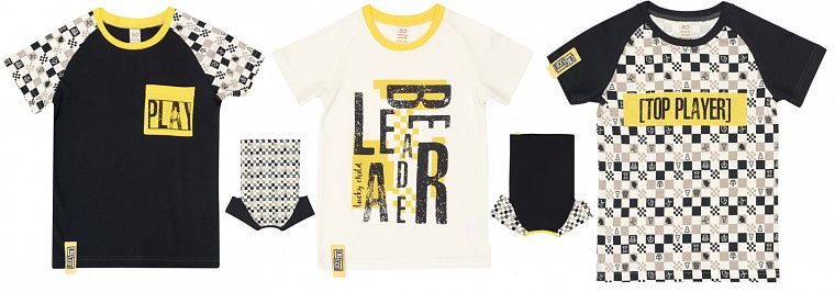 | Принты и паттерны: | паттерн коллекции «Шахматный турнир» (имитация шахматной доски), шрифтовые принты с тематическими лозунгами. |