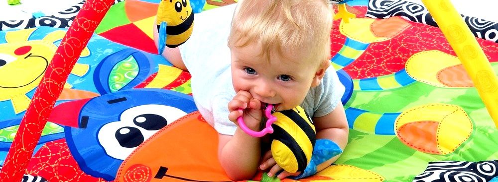 Третья по счёту, но не по значимости нужная покупка — это развивающий коврик. У нас был вариант с дугами и музыкальными игрушками. С первым ребёнком у нас такой вещи не было, и мы об этом жалеем. Пользоваться им мы начали тоже после 1 месяца. Коврик нам помог с лёгкостью выполнять следующие процедуры: смена памперса, подстригание ногтей, массаж, обработка пупка. Ребёнок разглядывал коврик и игрушки, тянул ручки, а мы в это время спокойно делали всё, что было необходимо, без слёз и капризов. И ещё на нём мы принимали воздушные ванны. Я рекомендую брать коврик с водоотталкивающим покрытием.
