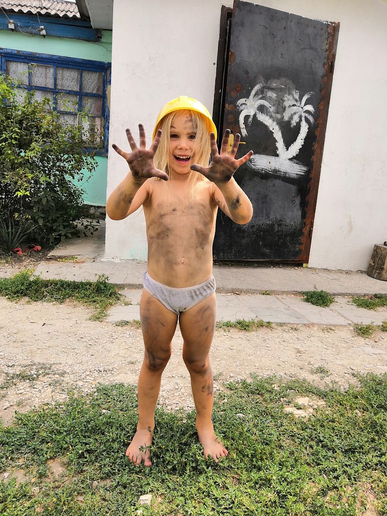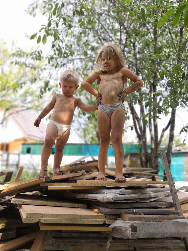 Дети были ещё совсем маленькие, 2-х и 4-х лет. Они резвились на улице, пытались залезать на деревья, в общем всевозможными способами изучали пространство. Вскоре они добрались до сарая, где хранилось ведро с золой. Бабушка собирала её из печи, чтобы в будущем использовать для удобрения земли. Дети, обнаружив это ведро, решили разобраться, что же в нём лежит. Для начала опрокинули его, вывалив всё содержимое наружу, а затем поняли, что зола отлично размазывается по коже, и занялись этим самым размазыванием. Когда я застала их за столь интересным занятием, первым моим желанием было поскорее их отмыть. Но не тут-то было! Дети стали убегать от меня по всему участку, не желая расставаться с боевой окраской. В конце концов они забрались на кучу досок, сложенных в саду, и мне пришлось минут 20 уговаривать их слезть, чтобы помыться.