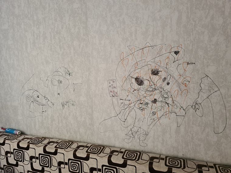 Второй случай связан с творчеством, если точнее – с изобразительным искусством, а если быть совсем точной – с рисованием на обоях. Думаю, мало кто из детей хоть раз не пробовал расписать стены дома оказавшимся в руке фломастером. Наша младшая дочь Тася тоже предпринимала такие попытки, но мне всегда удавалось убедить её рисовать в альбоме. Но однажды, усыпив мою бдительность, она всё-таки завладела маркером и изрисовала всю стену в детской. По масштабу «трагедии» она превзошла старших брата и сестру.