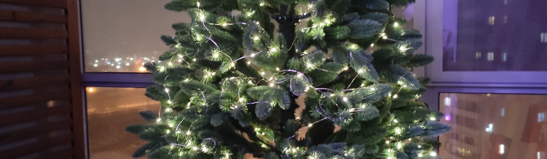 Нижние ветки, средние, и вот я дошла до верха нашей первой части ёлки. Честно скажу, я обматывала 2/3 ёлки. Она установлена на балконе и ветки, которые не видно из кухни, я оставила без украшения.