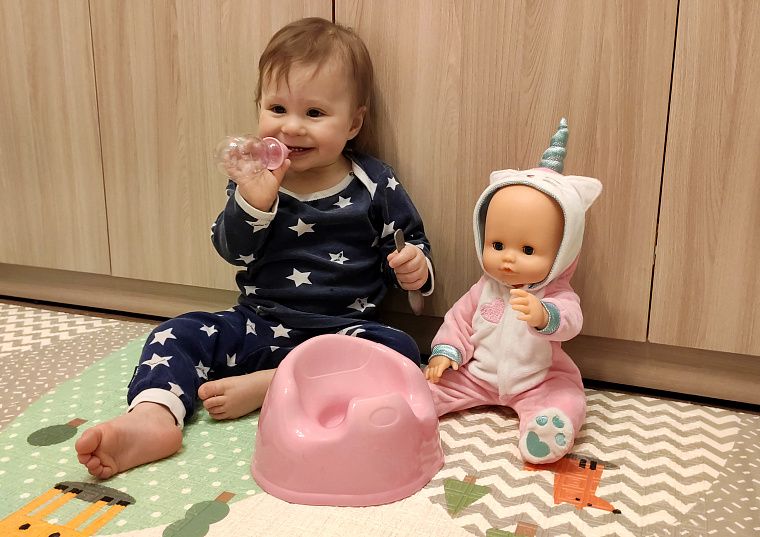 Пришло время покупать дочке первую куклу. Хотя мне хотелось скупить весь магазин, как только наша дочь начала ползать, первую куклу мы купили на годик. Это был большой симпатичный пупс, без волос, с двигающимися ручками и ножками. К ней шло приданное, которое у нас выдаётся под присмотром: горшок и бутылочка для кормления.