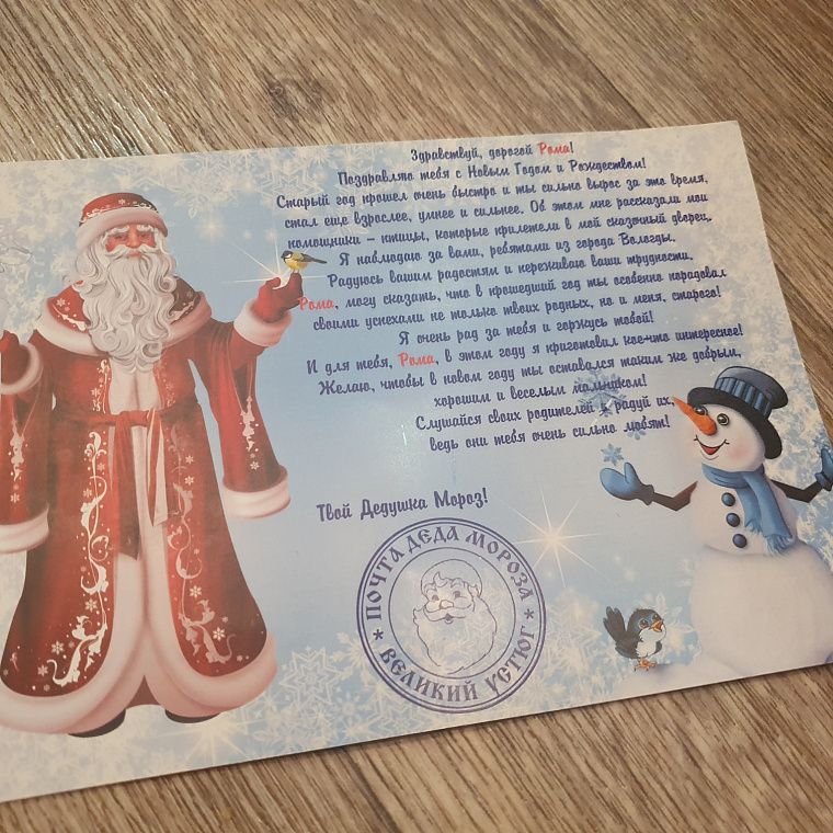 Каждый год, начиная с 4 лет старшего сына, мы пишем письма Дедушке Морозу. Как только старший сын начал понимать, что Новый год — это праздник, что есть такой волшебный дедушка, который детям дарит подарки, мы начали писать ему письма. Сначала я спрашивала Рому, какой бы он подарок хотел, сама писала, а сын рисовал рисунок для Дедушки Мороза в конце письма. По мере взросления сын писал сам, сначала просьбу о подарке, потом стал добавлять добрые пожелания. Чтобы сыну было интереснее, помимо подарка, я находила и распечатывала картинку с ответом от Деда Мороза и подписывала имя сына. Оставляли письмо под ёлкой, а на утро Дед Мороз забирал его, оставляя снежные следы.