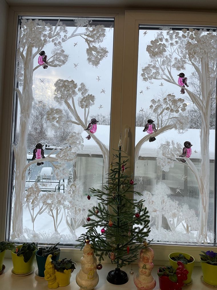Поэтому мы с энтузиазмом переключаемся на гуашь. Это совершенно иное волшебство! Кисточки в наших руках творят морозные картины: вот появляются пушистые ветви елей, заснеженные домики и вальс снежинки. Окно превращается в полотно зимней сказки. Конечно, в конце зимы приходится отмывать стёкла, но это того стоит, особенно когда видишь, как прохожие, спешащие по своим делам, останавливаются, засматриваются на наши окна и улыбаются. Эта всеобщая радость — лучшая награда за наши труды.