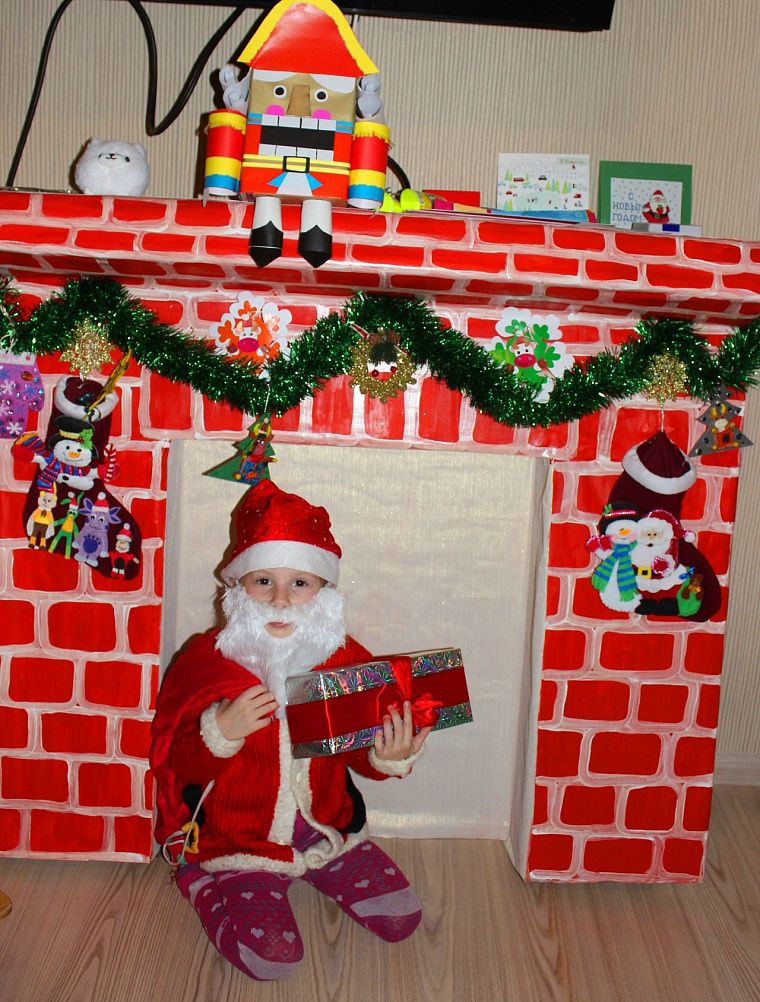 Нашим главным семейным достижением и предметом гордости стал камин, который мы собрали своими руками буквально из ничего. Для его создания потребовалось совсем немного: старые картонные коробки разного размера, оставшиеся от ремонта рулоны обоев с красивым рельефом, кисти и банки с акриловыми красками . Мама Аня, как главный инженер, собрала прочный каркас, скрепив всё скотчем и надеждой на чудо.