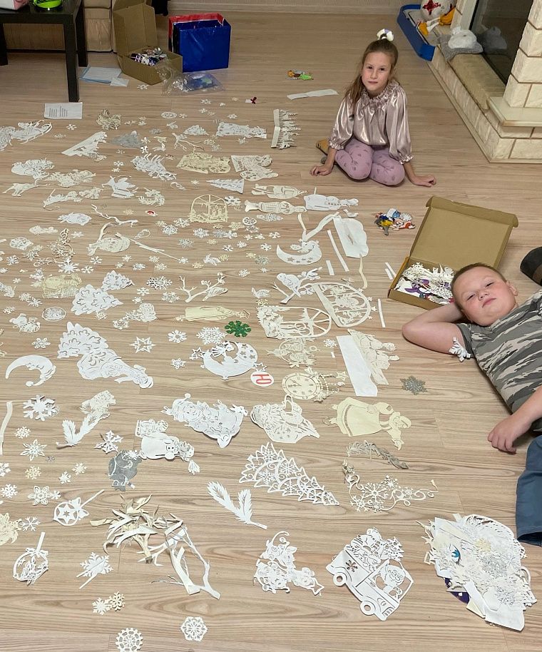 Самые сложные и тонкие композиции — затейливые олени в венках, целые городки с колокольнями — вырезает главный художник и вдохновитель, мама Аня. А Матвей и Виктория, берёт себе задания попроще: смешных снеговиков, пузатых пингвинов, звездочки и снежинки. Матвею 14, и он уже справляюсь с довольно сложными элементами, а Вике всего 9, но её старательности и аккуратности можно позавидовать — у неё получают идеально ровные ёлочки.