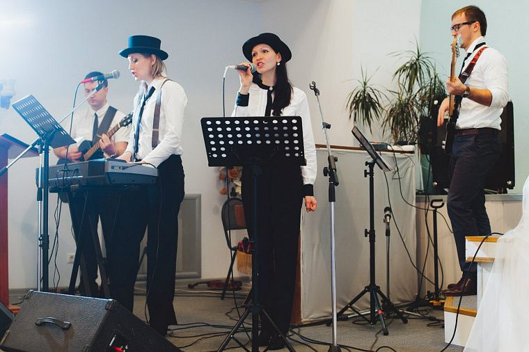 Музыкальная группа, в которой играл мой муж, тоже исполнила для нас несколько песен. Отмечу, что ребята проявили креатив в костюмах. Они пришли в белых рубашках, шляпах, чёрных галстуках. Даже девушки не побоялись выбиться из традиционного свадебного дресс-кода.