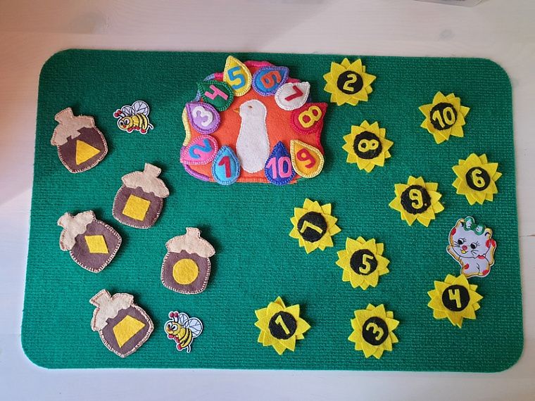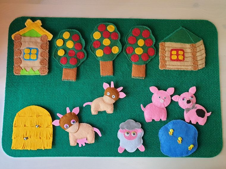 Мы используем фетровые фигурки. Это практичный и долговечный материал. Он не мнётся и не рвётся, в отличие от бумаги или картона, легко отстирывается. Сами понимаете, что от маленьких детей можно ждать любых сюрпризов, а в плане гигиены лёгкая стирка тоже большой плюс. Кроме того, фетр безопасен в использовании: фигурки крепятся к ковролину с помощью крепко пришитых липучек. Такой вариант куда лучше, чем магниты, которые малыш может проглотить.