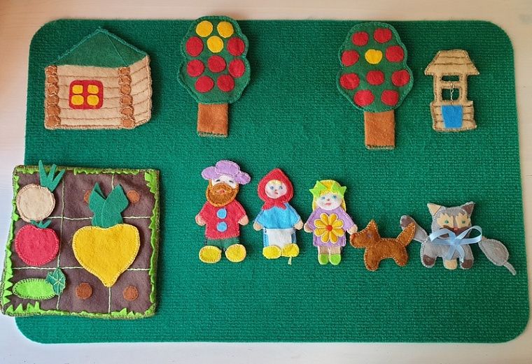 Фетровые фигуры и ковролин можно использовать в самых разнообразных случаях. К примеру, осваивать начальную геометрию, решать примеры, расширять словарный запас, изучать иностранные языки, сочинять собственные истории. Конечно, для годовалого карапуза такие задачи ставить слишком рано, поэтому пока мы ограничиваемся сказками. Но, безусловно, впереди нас ждут новые горизонты и интересные открытия.