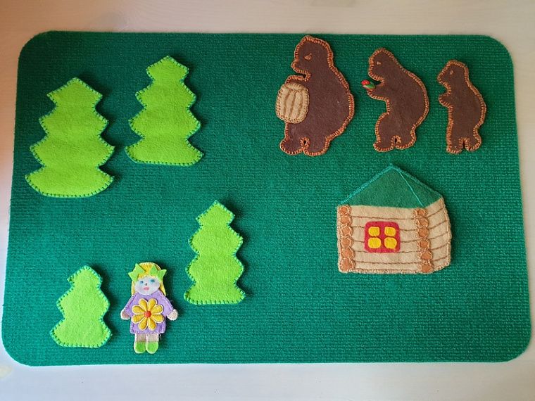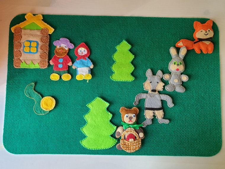 А ещё Маша любит сказки. Их мы не только рассказываем, но и показываем. Нет, не подумайте, что речь идёт о мультфильмах. Небольшое поле из ковролина стало волшебным пространством, где происходят абсолютно любые чудеса. Для этого нужно лишь немного умения, терпения и фантазии. Вместе с моей мамой мы изготовили из фетра фигурки героев из разных сказок и декорации. Теперь любое повествование мы стараемся продемонстрировать.