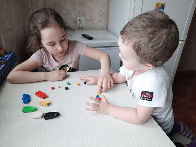 - Выполните аппликацию: разложите шарики так, чтобы после «расплющивания» получилась фигура. Дети просто делают цепочку, но можно заранее распечатать шаблон с контурами и вылепить рисунок.
