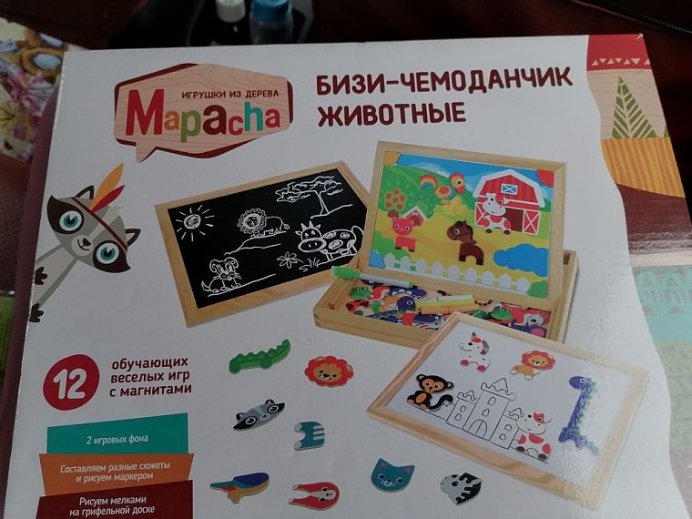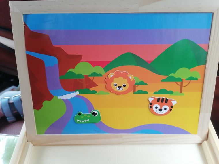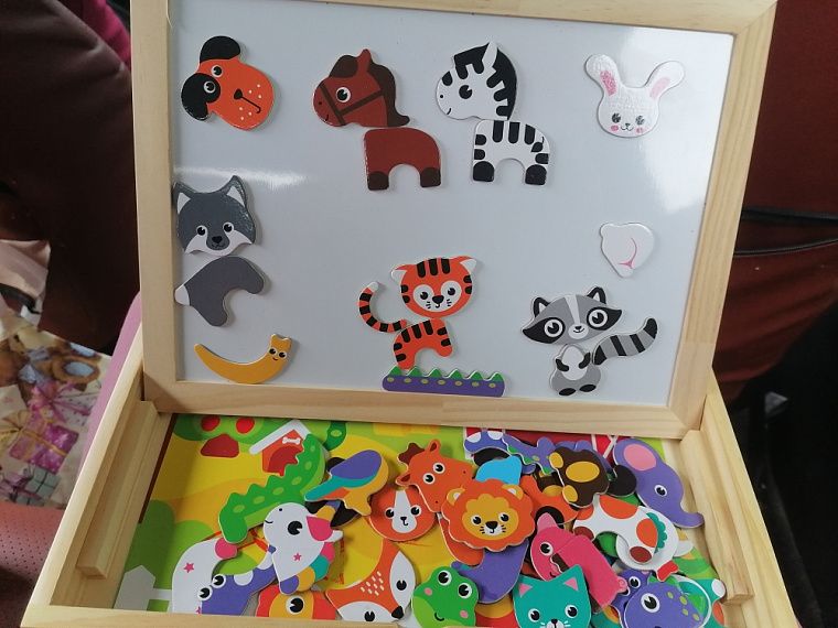 Мы выбрали деревянное изделие, которое состоит из среднего размера ящичка с крышкой. С одной стороны крышки – магнитная доска, с другой – грифельная. Крышка устанавливается на ящик в специальные прорези. Получается, что рабочая поверхность находится вертикально перед ребёнком, а в ящичке лежит всё необходимое для игры. Вся конструкция легко умещается на коленях либо ребёнка, либо взрослого, что очень удобно в дороге. В наборе имеются четыре разноцветных мелка, один маркер, множество магнитиков в виде различных частей тела животных, два листа-панорамы.