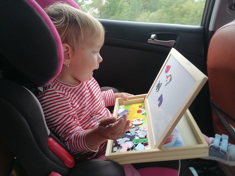 Ребёнок в возрасте двух лет – это невероятный «шилопоп», занять его чем-то на длительное время очень сложно, особенно, когда пространство ограничено только салоном машины на несколько часов. Бизи-чемонданчик стал нашей палочкой-выручалочкой в пути. Игрушки такого плана на некоторое время помогают увлечь малыша и дома, и особенно в дороге.