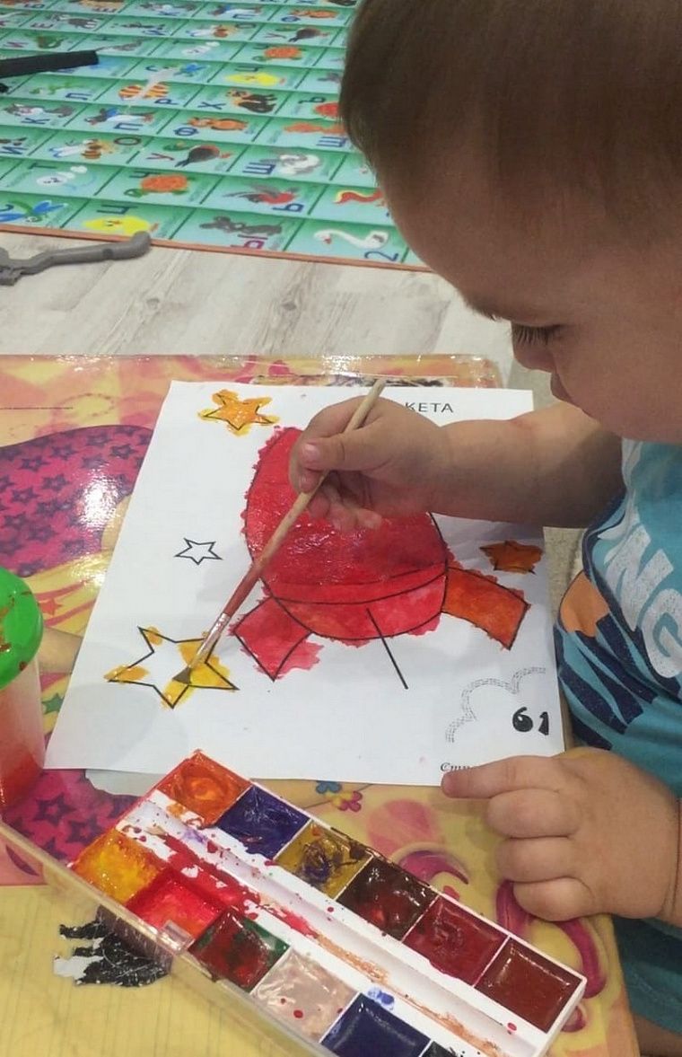 Во второй раз в садик мы пошли более подготовленными. Но так как садики закрыли, я решила продолжать заниматься каждый день с сыном сама. Наши занятия привели к тому, что Тимур научился раскрашивать карандашами и красками картинки, не выходя за границы. При этом кисточка правильно лежит в руке, ручка медленно и старательно делает мазки. Получаются достаточно аккуратно раскрашенные картинки. Даже родственники удивляются, что он этому научился в столь раннем возрасте.