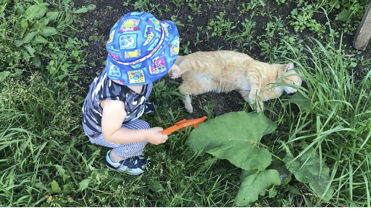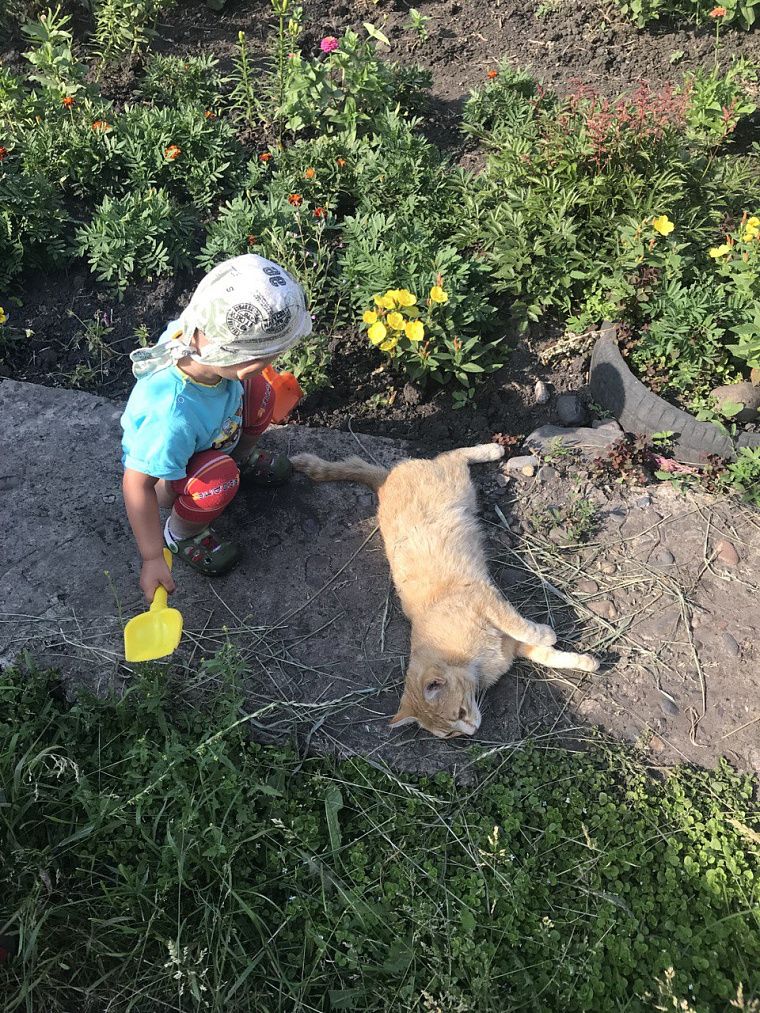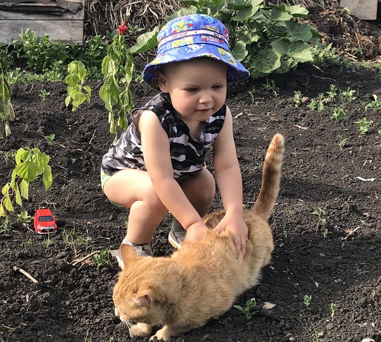 Когда Тимофей выходил в огород, Рыжик следовал за ним. Тимофей собирает ягодки с куста, Рыжик рядом ловит бабочек, веселя своего маленького друга. Ребёнок играет, кот лежит рядом. Везде они были вместе. Надо сказать, в моём детстве была похожая история, с нами тоже жил рыжий котик, который провожал меня до детского садика. Так и пропал, не вернулся. Удивительно, что у моего сына получилось примерно также.