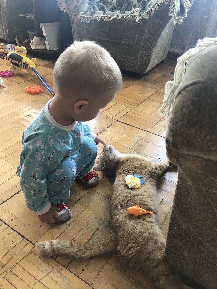 Полтора летних месяца, пока мы с сыном гостили у бабушки, наблюдали за удивительными отношениями терпеливого кота и двухлетнего ребёнка. А как они вместе играли, это надо было видеть! Малыш катнёт по паркету свою маленькую машинку, Рыжик подскочит вверх, широко расставив лапы, и вприпрыжку бросится догонять машинку. Догонит - лапой катнёт игрушку обратно Тимофею. Какое веселье ребёнку: смеётся, бежит за котом, снова катит в его сторону машинку. Потом, устав от такого развлечения, ложатся на пол в обнимку и отдыхают.