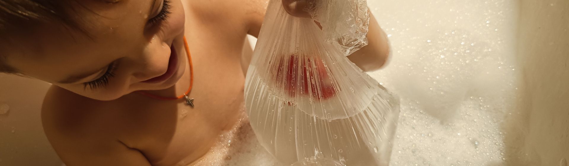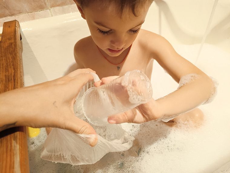 Сначала Миша с азартом набирал в пакет пену, предлагал мне её поесть, типа это мороженое. Мы подключили в игру ещё и стакан, который помогал нам в нашем магазине мороженого. Чуть позже, когда пена стала исчезать, Миша переключился на воду. Он её то набирал в пакет, то выливал, то больше, то меньше. Запускал в пакет с водой игрушки, представлял, что это аквариум с рыбками. А у нас как раз в ванной есть несколько, которые ещё и меняют цвет при попадании на них тёплой или горячей воды.