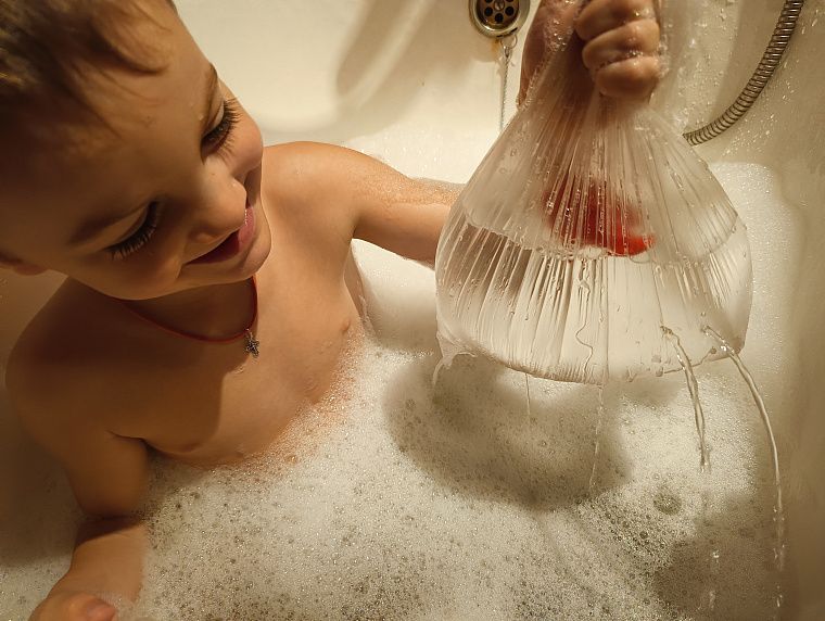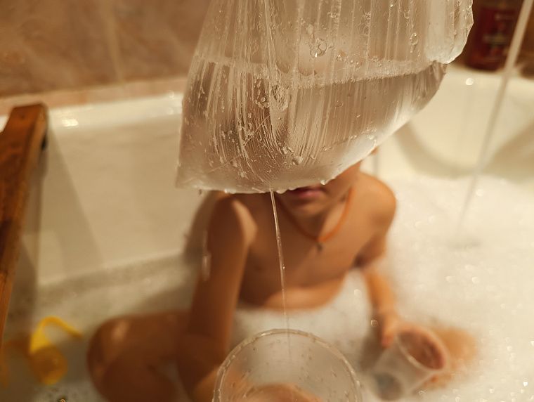 Каким было моё удивление на следующий день, когда Миша вновь попросил пакет, только новый, без дырочек – и всё по новой. Мы продавали мороженое, прятали игрушки, искали пакет по дну ванной, ведь он терялся из виду и прятался в пене, затем поливали сына, как будто из лейки, заваривали кофе. Всё это продолжалось не один и не два дня, каждый наш подход в ванну без пакета не обходится. Как хорошо, что пакетов много, а ребёнку весело. А главное, затянуло ведь не только сына, но и меня. Мы показали папе наши игры, теперь и он ходит с Мишей купаться, все выходят сырые, счастливые и довольные.