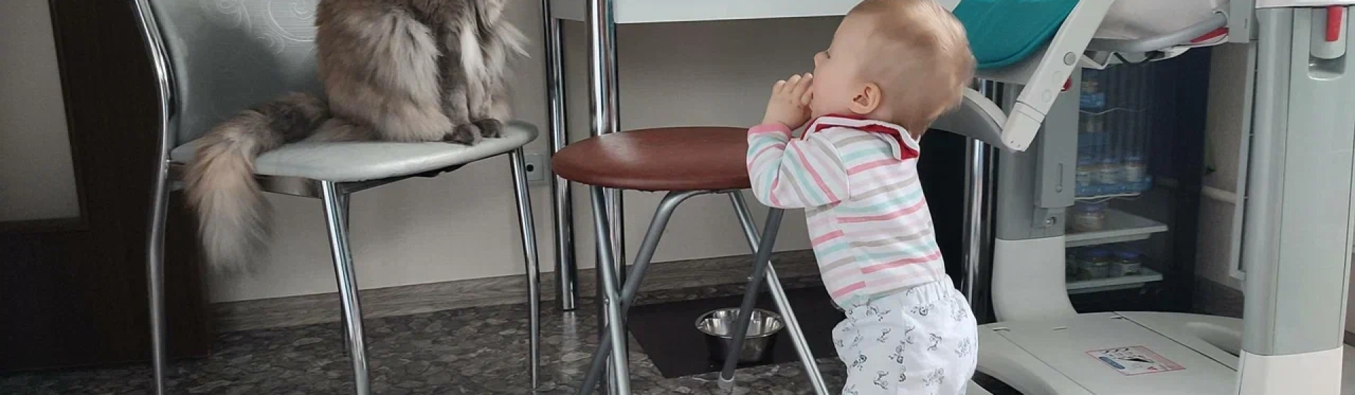 Первый переворот произошел, когда кошка ела у миски. Животные - двигатели активности у детей. С этого момента пришлось строго контролировать передвижения дочки и кошки. Первые четвереньки - за кошкой. Кошка еще могла чувствовать себя спокойно. Она понимала, что передвигается быстрее дочки, к тому же могла специально подождать, пока дочка доползет до нее, потянутся и в последний момент убежать.