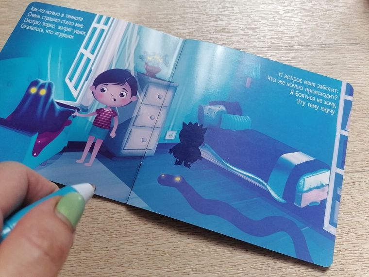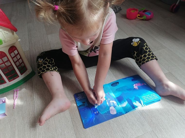 Книжка мне попалась в рекомендациях на маркетплейсе, когда я искала подарок для маленькой дочери подруги. Обычных книг у дочери уже достаточно, а вот книгу с фонариком я видела впервые. По описанию стало понятно, что некоторые фрагменты иллюстрации в книге видно только тогда, когда на них попадает свет фонарика. Цена книги была небольшая, и я её заказала для своей дочки. Просто была интересна сама идея.