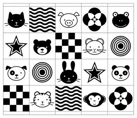 - Изображения — простые: полоски, круги, зигзаги, спирали, контрастные лица, звёзды, силуэты животных, сердечки, квадраты.