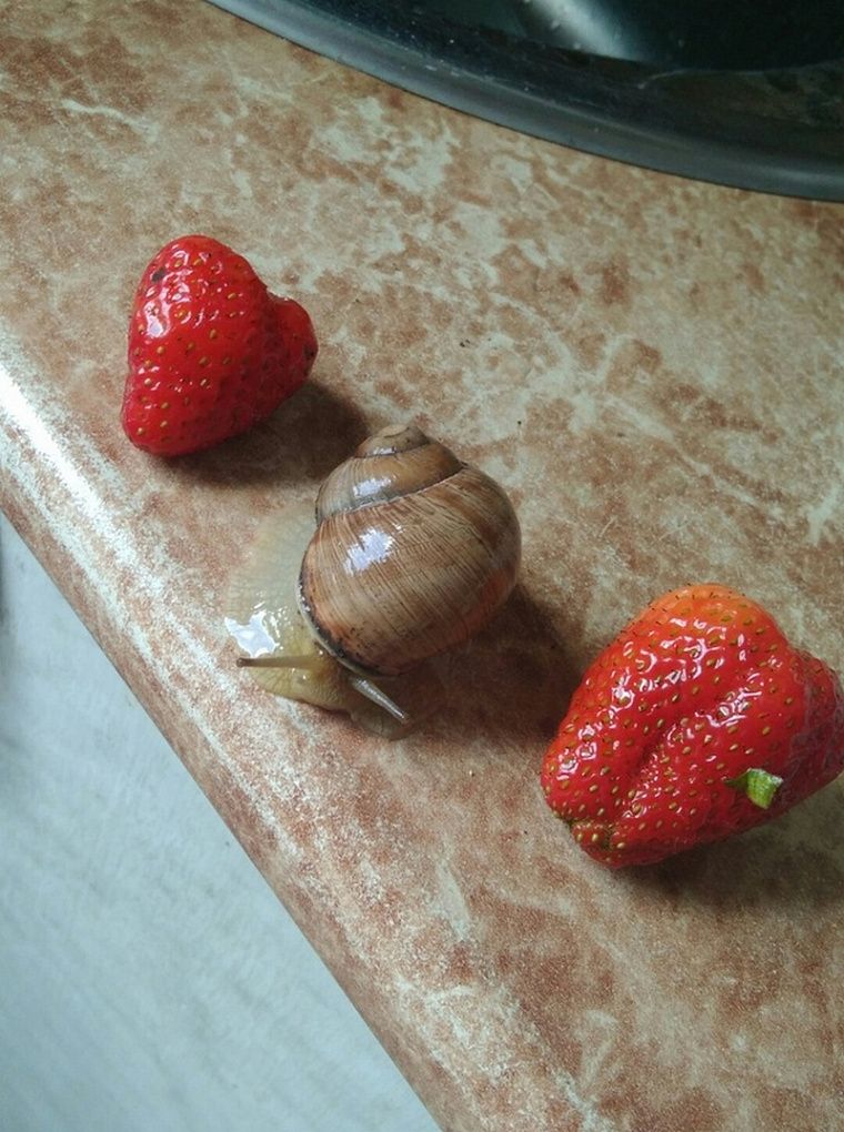Ещё в гости приползла замечательная улитка, которая захотела попробовать нашей вкусной клубники. Фотографии получились очень милые и красивые. Она погостила у нас один день, и мы отпустили её на волю. Потом сын попросил купить ему домашних улиток, обещал за ними ухаживать. Посмотрим, что из этого получится.
