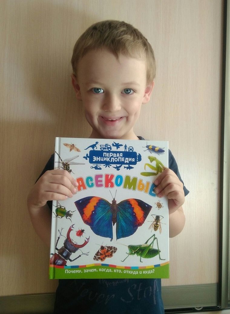Вот такое хобби появилось у нашего сына. Мы поддержали это увлечение и даже заказали первую энциклопедию про насекомых. Это очень яркая книга, читаем её с интересом и знакомимся с новыми неизвестными нам видами. Заодно прививаем любовь сына к чтению. Ребёнок с удовольствием посмотрел фильм про насекомых «Букашки», хотя он довольно длинный. Советую его для семейного просмотра.