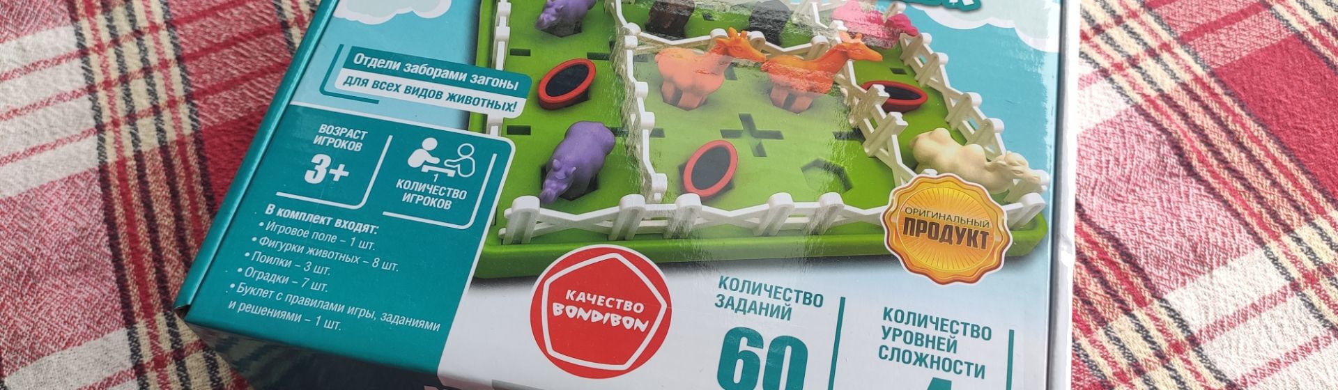 Общие ощущения от игры приятные. Плотная красивая коробка с шикарной картинкой – это первое впечатление, которое начинается с упаковки. Формат небольшой, её можно бросить папе в рюкзак и взять с собой в гости к бабушке с дедушкой. В коробке лежит инструкция, игровое поле, 8 игрушечных фигурок: слон, верблюд, жираф, носорог – все парами, 3 поилки, 7 оградок. Пластик приятный на ощупь, плотный, без посторонних запахов, животные – симпатичные, приятно держать в руках.