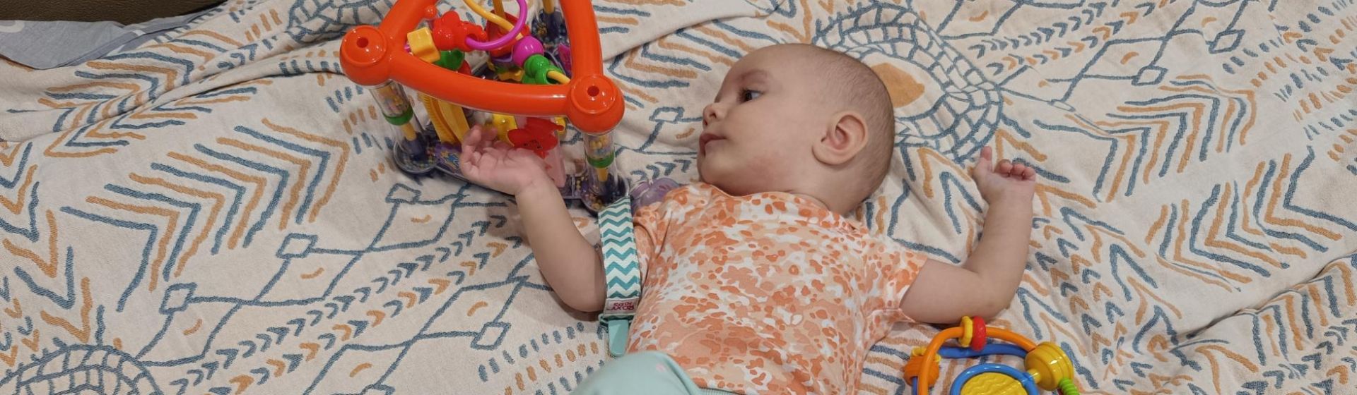 игры. Ручки очень удобные для захвата детской ладошкой. В свои шесть с небольшим месяцев Мила играет лёжа на спине или животе. Мы стараемся находиться рядом и придерживать треугольник, чтобы она могла перебирать элементы игрушки обсими руками. Пальчики всё время в движении: крутят, вертят, перебирают.