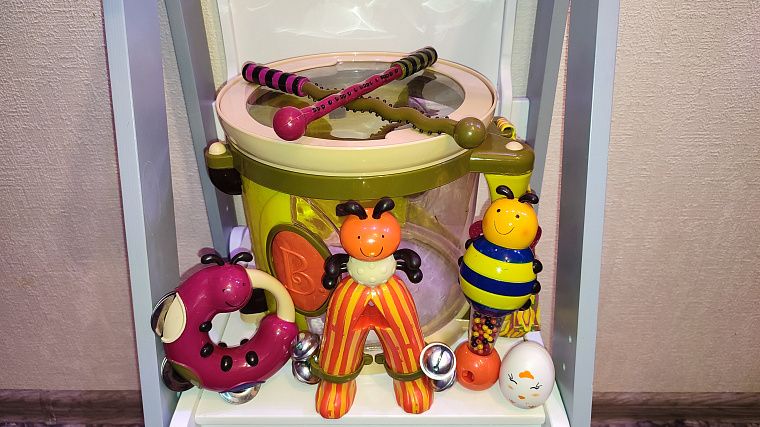 А погремушка в виде яйца? Везде разный звук. Дочка с удовольствием играет, трясёт и стучит. Барабанные палочки – да, доставили они мне хлопот, дочь первое время ими стучала везде и всюду, конечно же, за исключением барабана.