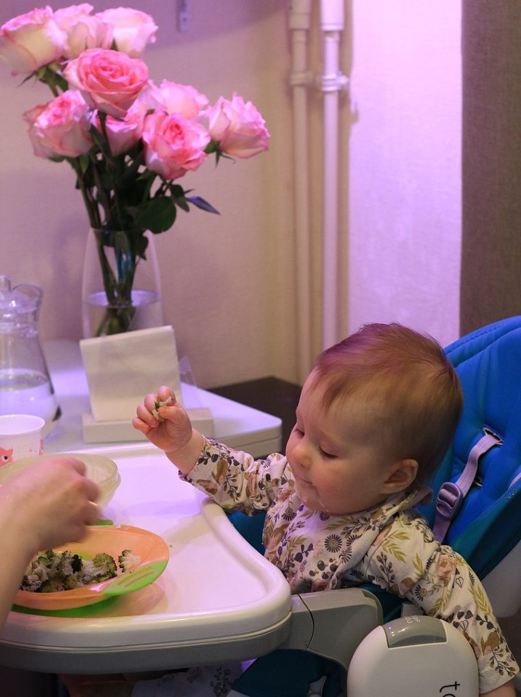 Новый месяц – новые пристрастия. Дочь всё больше и больше требует кусочки, но очень устаёт их жевать. Поэтому мне приходится часть еды давать кусочками, а основную пищу сначала проминать вилкой и потом давать. Причём вечером дочь предпочитает чистые вкусы, когда каша отдельно, овощи отдельно и обязательно тарелка десерта с соцветиями отварных овощей. Да, это частный случай. Но, возможно, кто-то тоже с этим столкнётся. Пока я не попробовала давать всё по отдельности, рот закрывался или еда вмиг выплёвывалась.