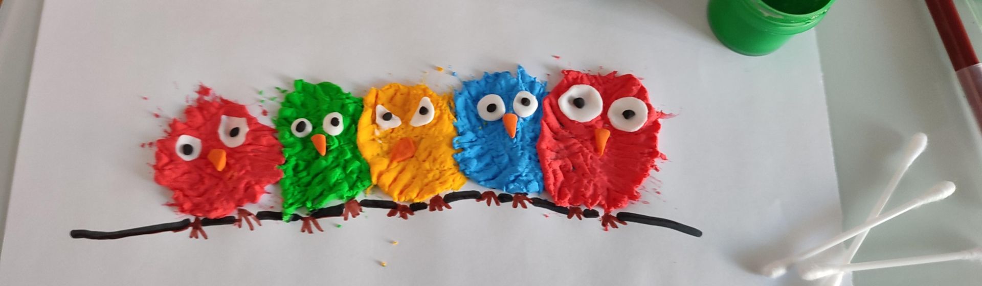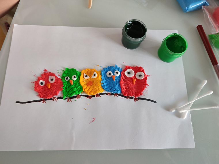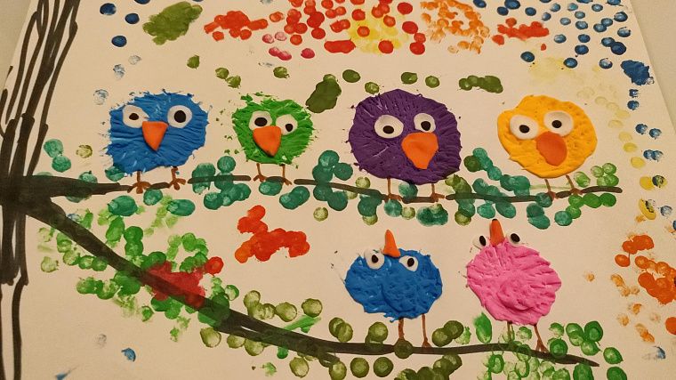 Теперь берём коричневый или чёрный фломастер и рисуем ножки. Птички сидят на ветке, а значит начинаем рисовать дерево с ветками. Остаётся только нарисовать листву. Открываем несколько баночек с гуашью, аккуратно окунаем кончик кисти и даём малышу. Вторую палочку окунаем и берём себе, показываем, как надо ставить точечки. Разноцветная листва получается легко и просто. И вот красивая поделка готова, остаётся дождаться, пока она высохнет, после чего можно вешать на стену и любоваться.