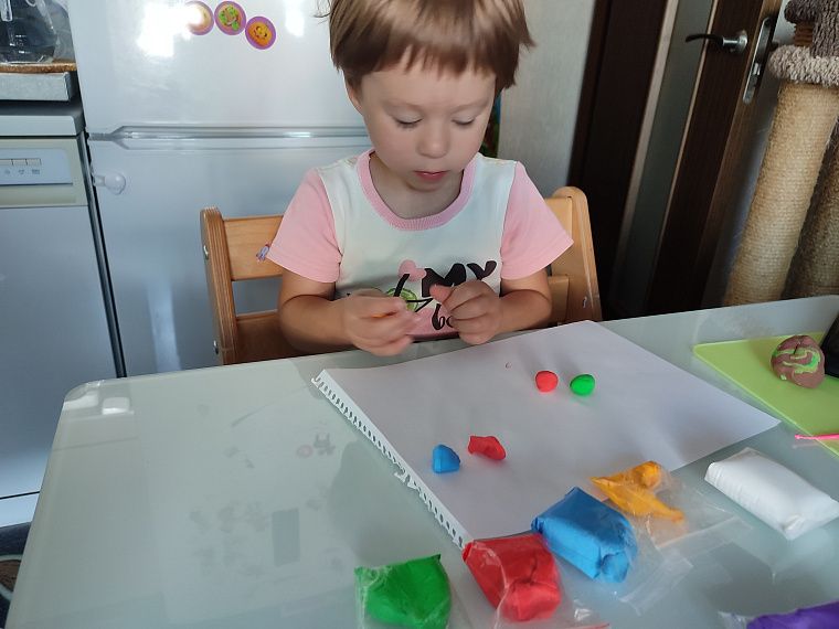 Дочка у нас выдумщица, на днях очень нас насмешила. Папа ей вечером пел песенку: «Придёт серый волчок и укусит за бочок.» Дочка задумалась, надо спасать свой бочок. И вот мы сидим, пластилин лежит перед ней, ей надо, чтобы мама отщипнула пластилин разных цветов и дала ей. С интересом наблюдаю, что будет делать дочка. Старательно размяв весь пластилин, она начала его смешивать и перемешивать. «Надо красиво сделать!» – так комментирует свои действия дочь. Я молча сижу и наблюдаю, ведь нельзя же спугнуть творческий момент. «Вот бочок для волка.» – сказала дочка. Теперь она готова – если придёт волчок, бочок из цветного пластилина будет привлекать его больше, чем Наташин. Творческий подход налицо!