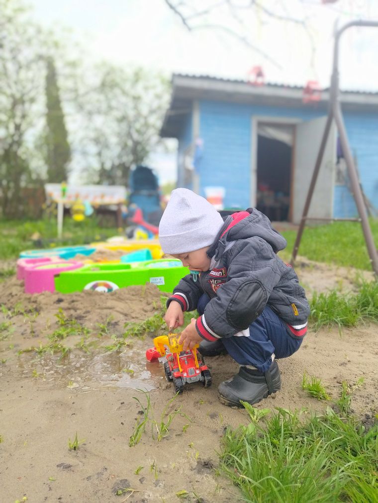 И вот песочница собрана, песок засыпан, игрушки тоже. Ура! Ребёнок занят! Главное, одежду похуже, особенно после дождя. И началось пересыпание, переливание. Почему-то Миша все ниши в бортах полюбил заполнять водой, а потом насыпать в неё песок и эту жижу перетаскивать с одного места на другое. Мы сначала были в небольшом шоке, но потом поняли, что у нас есть какое-то время тишины и покоя.