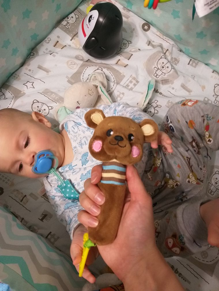 Мила сначала тоже не выделяла его из общей массы игрушек. Но недавно мы стали замечать, что именно медвежонок наиболее часто оказывается в её руках.