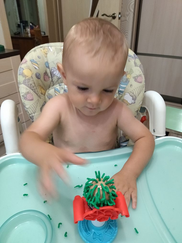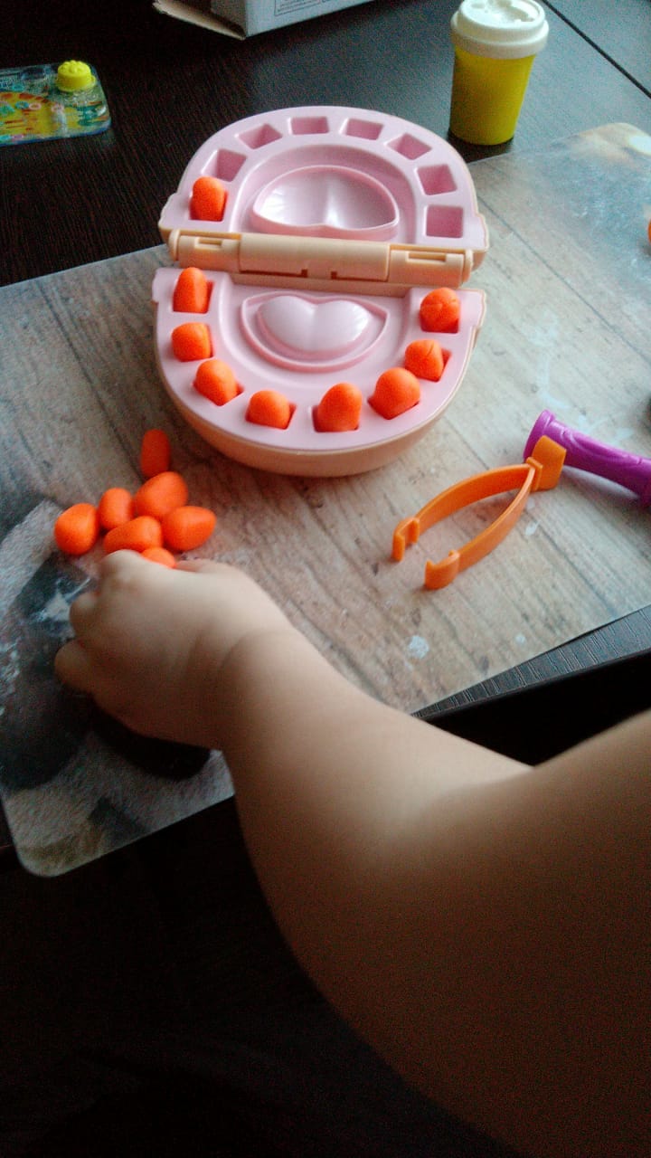 На второй день рождения сын попросил набор «Зубастика» этой же фирмы, и мы с радостью приобрели его. Даже Мила теперь изучает его, правда, пока без пластилина. Так же Миша до сих пор любит пользоваться шприцами, он называет их «уколами», попросту выдавливая червяков, а потом режет их на части, получаются сердечки, звёздочки, цветочки. В период болезни пластилин нас очень спасает.