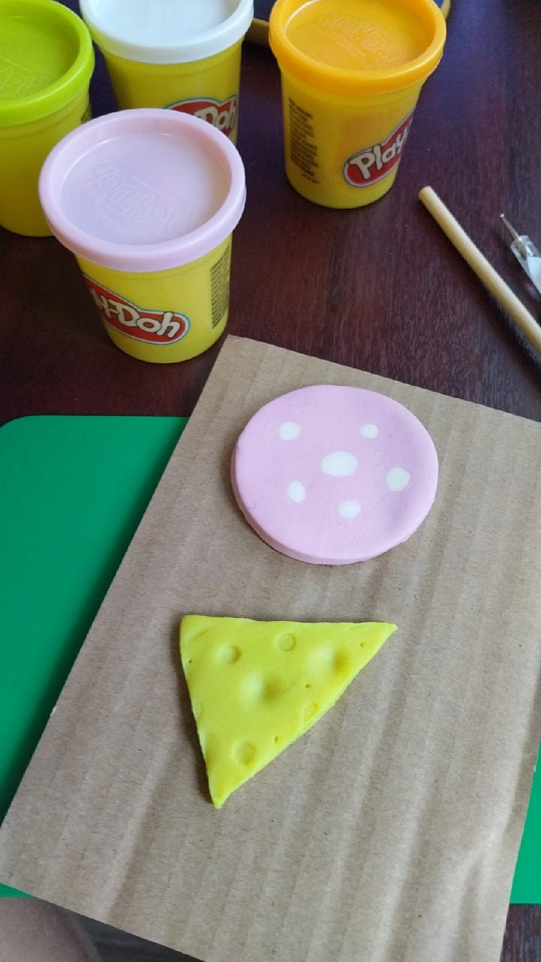 Слепила продукты, которых у нас не было в игровом обиходе. Они достаточно быстро высохли и пошли в игру. Конечно, что-то сломалось, что-то потерялось, но котлета с макаронами всё ещё принимают участие в наших играх, чему я безумно рада.