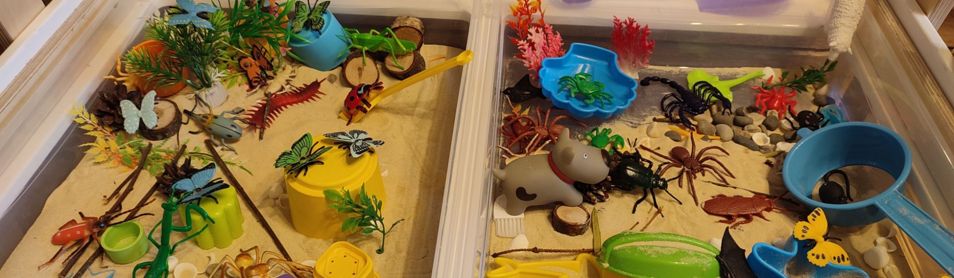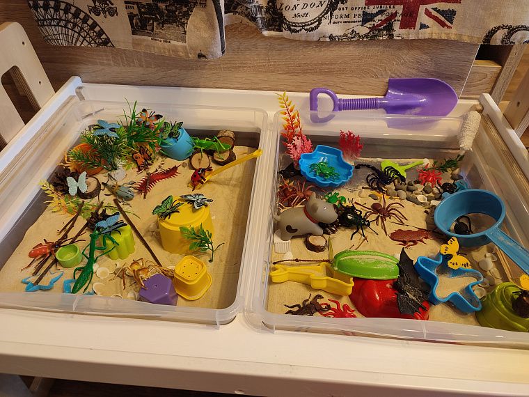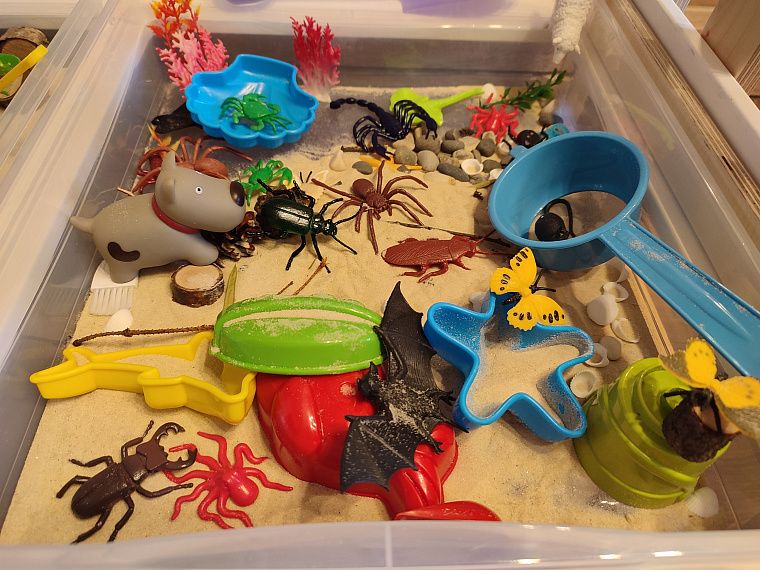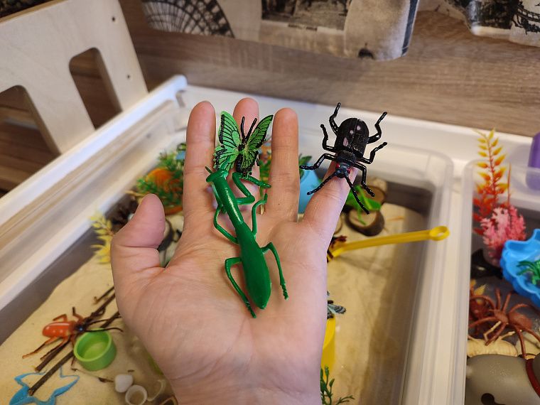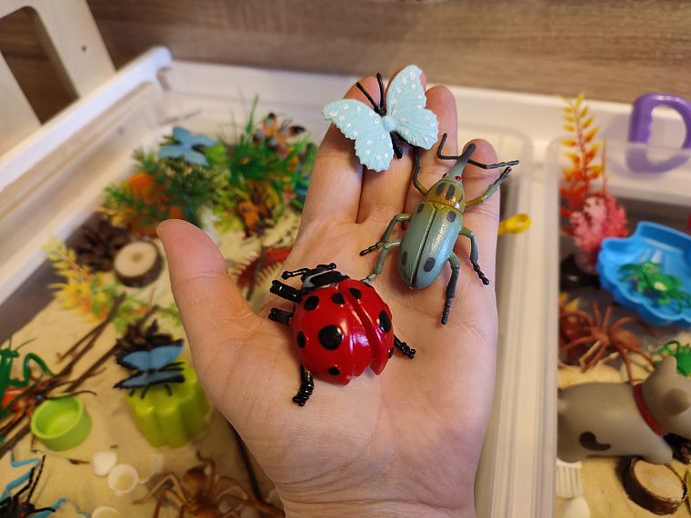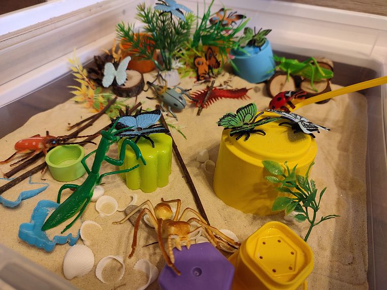 Закончили, и нас ждёт второй контейнер. А там – раздолье, бабочки и насекомые прячутся, больше зарослей травы и разных спрятанных кладов. Пока дочь играет, я наслаждаюсь чашечкой кофе. Тишина, спокойная игра ребёнка. А сколько тактильных разнообразных ощущений! Конечно, потом надо будет всё равно убирать песок с пола, но зато сколько различных игр включает в себя это мероприятие. Мы узнаём и запоминаем название бабочек, жуков, кузнечиков, долгоносика, божью коровку.